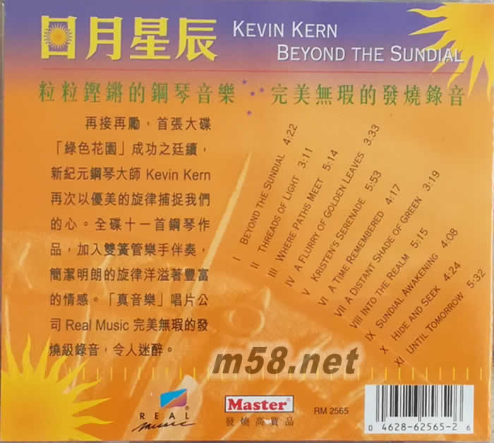 日月星辰 BEYOND THE SUNDIAL 時間之河 新世紀純音樂(m58.net) 日月星辰 BEYOND THE SUNDIAL 簡潔明朗的旋律處處洋溢著豐富的情感 再接再勵,綠色花園成功之延續,KEVIN KERN 再次以優美的鋼琴旋律,加入雙簧管樂手伴奏,簡潔明朗的旋律洋溢著豐富的情感。真音樂唱片公司REAL MUSIC 完美無瑕的發燒錄音,令人迷醉!