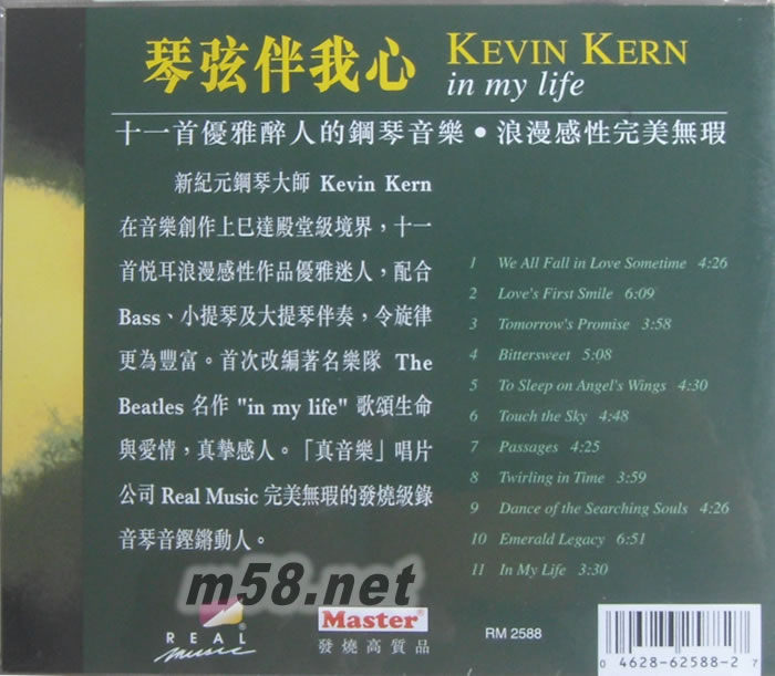 琴弦伴我心 IN MY LIFE 新世紀純音樂(m58.net) 十一首優雅醉人的鋼琴音樂、浪漫感性完美無瑕 新紀無鋼琴大師KEVIN KERN在音樂創作上已達殿堂級境界,十一首悅耳浪漫感性作品優雅迷人,配合BASS、小提琴及大提琴伴奏,令旋律更為豐富。首次改編著名樂隊THE BEATLES名作“IN MY LIFE”歌頌生命與愛情,真摯感人,[真音樂]唱片公司REAL MUSIC完美無假的發燒級錄音鏗鏘動人。