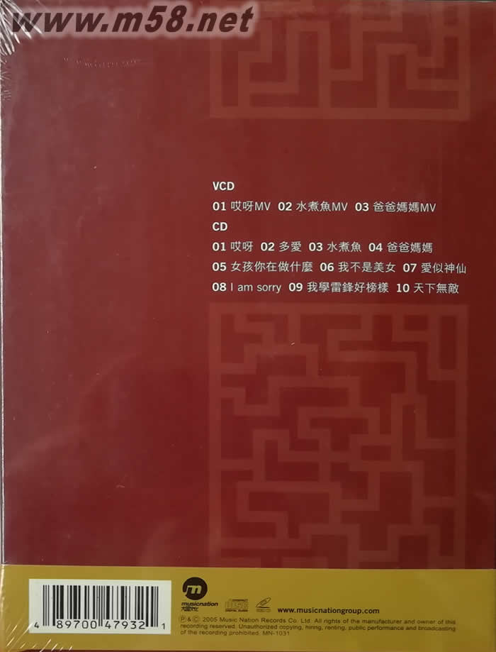 CD 01. 哎呀 02. 多愛 03. 水煮魚 04. 爸爸媽媽 05. 女孩你在做什么 06. 我不是美女 07. 愛似神仙 08. I am sorry 09. 我學雷鋒好榜樣 10. 天下無敵