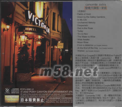 挪威甘菊 CAMOMILE EXTRA(發燒天碟版+新曲)(m58.net) 金碟采用24BIT/192KHZ DSP MASTERING 母帶重新制作11首靚聲示范曲,再增添收錄3首絕佳英語歌曲 FROM A DISTANCE別具真性情演繹,祝愿世界紛爭與災難不再! AT THE END OF THE DAY LE COUPLE夫婦攜手創作,愛到盡頭,矢志不渝 WISHES LE COUPLE成名作[溫暖的詩句] 英文版!! camomile extra 發燒天碟版+新曲 資深樂評激節贊賞 全港電臺好評熱播! [溫暖的詩句]原唱者.靚聲組合Le Couple之主音歌手--藤田惠美Emi Fujita 精僻演繹不朽雋永金曲.個人首張英語專輯 夫婦組合Le Couple的主音藤田惠美(Emi Fujita)所推出之首張個人英語大碟(camomile),實踐了與挪威音樂人兩地合作灌錄歌曲的心愿!本碟所收錄的不朽名曲,均是藤田惠美以半年時間奔走挪威與日本兩地的制作,以異國情懷的音樂交流,將北歐那種純潔無瑕的acoustic sound帶到東方土地上。 大碟自推出后一直獲得各大專業樂評人及電臺DJ贊譽欣賞,好評如潮。今次全新的Hi-Fi發燒天碟版采用了24bit/192kHz DSP MASTERING將母帶重新制作,擴闊了音場效果,人聲與音色更為圓潤,締造比原版更動聽的重播音域! 另外,更特別收錄多3首由Le Couple演繹的英語作品,特別推薦夫婦包辦曲詞的At the End of the Day,當然不能缺少Le Couple成名作[溫暖的詩句]英文版Wishes! 大碟題目(Camomile/甘菊),是一種制成茶包后,可使人進入松弛狀態的植物,恰似本大碟中,Emi以終極至上的歌唱技巧,與大家共同進行一次音樂治療旅程。