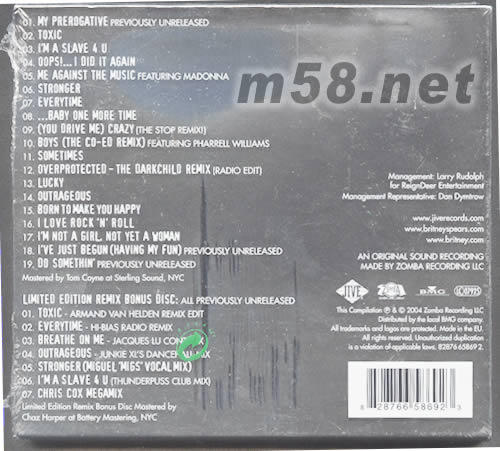 1、MY PREROGATIVE/PREVIOUSLY UNRELEASED 2、TOXIC 3、I‘M SLAVE 4u 4、OOPS!I DID IT AGAIN 5、ME AGAINST THE MUSIC 6、STRONGER 7、EVERYTIME 8、BABY ONE MORE TIME 9、(YOU DRIVE ME )CRAZY(THE STOP REMIX!) 10、BOYS(THE CD-CD REMIX) 11、SOMETIMES 12、OVERPROTECTED-THE RARKCHILD REMIX 13、LUCKY 14、OUTRAGEOUS 15、BORN TO MAKE YOU HAPPY 16、I LOVE ROCK ’N‘ ROLL 17、I’M NOT A GIRL NOT YET A WOMAN 18、I‘VE JUST BEGUN (HAVING MY FUN) 19、DO SOMETHIN’/PREVIOUSLY UNRELEASED MASTERED BY TOM COYNE AT STERLING SOUND,NYC LIMITED EDITION REMIX BOUUS DISC:ALL PREVIOUSLY UNRELEASED 1、TOXIC/REMAND VAN HELDEN REMIX EDIT 2、EVERYTIME/HI BIAS RADIO REMIX 3、BREATHE ON ME 4、OUTRAGEOUS 5、STRONGER(MIGUEL ‘MIGS’VOCAL MIX) 6、I‘M A SLAVE 4U(THUNDRPUSS CLUB MIX) 7、CHRIS COX MEGAMIX