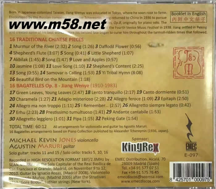 暢銷(xiāo)組合西班牙吉他巨星Agustin Maruri ,伙拍大提琴名家 Michael Kevin Jones 以二重奏演繹多首中國(guó)民謠,茉莉花,康定情歌等及中國(guó)近代音樂(lè)大師江文也的多首斷章小品,悅耳動(dòng)人,高分晰力錄音音色靚絕。