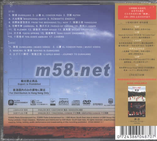 價格為估,以實到貨為準! 敦煌(CD+DVD)特別版(m58.net) 請點看產品正、背面大圖 女子十二樂坊繼進軍美國并發行《Eastern Energy》大碟後,2005年踏足敦煌,以絲綢之路為題,推出唱片《敦煌》!隨碟附送DVD,當中輯錄了兩首新歌MV、制作特輯及女子十二樂坊的「敦煌之旅」的片段。香港特別版加送迷你3吋VCD,收錄賀年歌曲卡拉OK MV「恭喜發財」及「財神到」。 另外推介歌如下∶ 「山鷹」—改編自Simon & Garfunkel經典名作 「大地輕聲」—敦煌音樂之父喜夕郎新作 「從開始直到現在」—人氣韓劇《冬日戀曲》 「十面埋伏」—張藝謀電影《十面埋伏》主題曲「LOVERS」