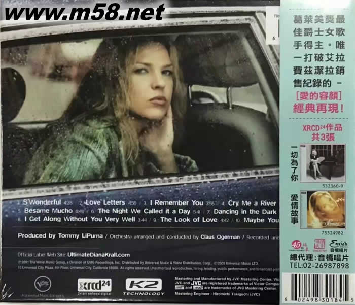 THE LOOK OF LOVE XRCD(m58.net) 唱片史上橫跨流行與爵士最佳歌手唯一選擇,2000年葛萊美獎最佳爵士歌手,2002年加拿大朱諾獎三項大獎,2002年葛萊美獎最佳錄音工程獎 2001年新作"愛的容顏"籌備的時候,克瑞兒有天晚上在紐約的公寓裡聽著法蘭克.辛納屈、茱莉.倫敦、納京高以及麥可.布雷克與編曲家克勞斯.歐格曼合作的唱片。隨後她突發奇想跑去問湯米.利普瑪,是否能與克勞斯.歐格曼在下張專輯中合作,因為克勞斯.歐格曼和強尼.曼德爾一直是克瑞兒最喜歡的作曲搭檔兼編曲家。尤其歐格曼與辛納屈、芭芭拉.史翠珊、安東尼.卡洛.喬賓合作過多張精彩專輯,更讓人永遠聽不膩。雖然歐格曼已經不再為其他藝人編曲而專心於自己創作的鋼琴奏鳴曲和小提琴協奏曲的作品,但克瑞兒仍然抱持希望。就在克瑞兒前往慕尼黑表演時,利普瑪安排了他們的會面,最後歐格曼也欣然答應了這項合作計畫。利普瑪和歐格曼也超過十年未曾共事,"愛的容顏"再度將此兩位傳奇人物聚在一起,簡直是破天荒的組合。 "愛的容顏"除湯米.利普瑪負責製作,歐格曼擔任編曲、指揮外,倫敦交響樂團,知名吉他手羅素.馬龍都在伴奏的行列。內容上則包括多首爵士、流行經典,標題曲出自大名鼎鼎Burt Bacharach/Hal David之筆,這首歌原由女歌手Dusty Springfield與巴西樂手塞吉歐.曼德斯的合唱團兩度唱紅的流行曲。從茱莉.倫敦深情演唱的招牌作"Cry Me A River"、傷心小調"I Get Along Without You Very Well",到西班牙文浪漫經典"Besame Mucho"(熱情擁吻)都是歌迷們期盼已久的克瑞兒式曲調。這張專輯製作時克瑞兒一口氣灌唱多首歌曲,據她自己的說法:「真希望能發行成一張雙片CD」,從這些歌曲中細心挑選成單張的"愛的容顏"絕對又會是戴安娜.克瑞兒新的里程碑。