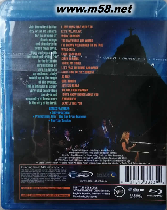 LIVE IN RIO BLURAY 藍光BD(m58.net) Diana Krall 最閃爍的演出 2008年HD收錄 在巴西舉行的演唱會 她與自己的樂隊和管弦樂了 帶出Bossa Nova的味道 歌曲包括在Quiet nights 專輯:walk on by,quiet nights, the boy from ipanema 等等