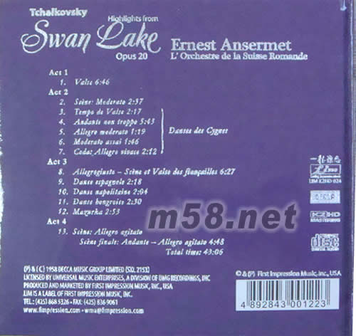 天鵝湖SWAN LAKE K2HD 紫色封面(m58.net) K2HD系列有: 1 THIS IS K2 HD SOUND! K2HD 2. FALLA EL AMOR BRUJO K2HD 3. 天鵝湖SWAN LAKE K2HD 4. FLAMENCO 法蘭明高吉它 K2HD 5. BAMBOO(大綠竹 尺八大師 K2HD 6. 赤壁懷古K2HD(李煒古箏獨奏) K2HD 7. 黑教堂 CANTATE DOMINO K2HD