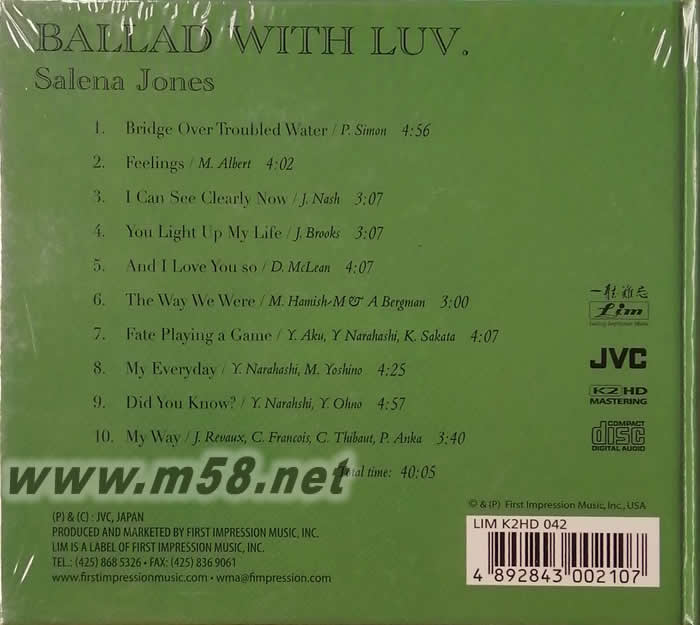 愛的情歌 BALLAD WITH LUV K2HD(m58.net) 著名黑人女歌手賽琳娜瓊斯的《愛的情歌》。Fim用K2 HD技術再版JVC原始模擬母帶,音效更上一層樓! 賽琳娜瓊斯1944年1月29日出生在美國弗吉尼亞州的新港。她從小就醉心于爵士樂歌唱,很早就在自己的家鄉(xiāng)開始了歌唱生涯。賽琳娜瓊斯有著一副似乎是煙熏火燎過的暗淡但又極具磁性的獨特嗓子,寬厚而共鳴豐富的嗓音而獨具魅力!在樂壇馳騁30多年的賽琳娜瓊斯,對各種音樂風格都能夠駕馭自如的,無論是演唱具有神秘韻致的新創(chuàng)歌曲,還是予人超凡美感的情歌,甚至是搖擺化的節(jié)奏歌曲,賽琳娜瓊斯都能以自己真誠、親切的詮釋風格贏得大家的喜愛。她甚至被比肩為爵士天后Ella Fitzgerald?! ? 《愛的情歌》原本是JVC的專輯,日本JVC的唱片一向以制作精良,音色溫暖著稱。如今Fim公司推出效果更佳的K2 HD發(fā)燒版本,無異于爵士樂迷的福音?! ? 這張專輯收錄的全部是經(jīng)典名曲,聆聽賽琳娜瓊斯的演繹,則另有一番不同的滋味