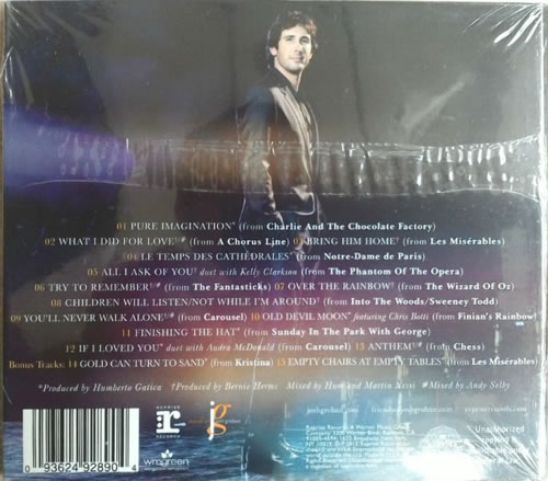 1. PURE IMAGINATION 純真印象 選唱自《巧克力冒險工廠》的1971年電影版名曲,是個性怪異但保有赤子之心的威利旺卡,介紹自己的巧克力工廠時所唱之歌 2. WHAT I DID FOR LOVE 情到深處無怨尤 選唱自1975年推出至今曾創下百老匯演出最久票房記錄的《歌舞線上》,唱出一位表演工作者為了自己所愛,愿意付出一切絕不后悔的心情 3. BRING HIM HOME 帶他回家 選唱自締造連續演出30年的傳奇音樂劇《悲慘世界》,描述尚萬強面對女兒的愛人垂死之際,祈求上帝保他平安,並愿捨身相換之歌 4. LE TEMPS DES CATHÉDRALES 大教堂時代 選唱自有史以來最受歡迎的法語音樂劇《鐘樓怪人》,此曲是由吟游詩人於開場時歌詠,描繪15世紀末巴黎的愛與慾望之歌 5. ALL I ASK OF YOU 我所求於你 (與 凱莉克萊森 深情對唱) 選唱自大師韋伯的《歌劇魅影》,是在魅影殺人之后,女主角克莉絲汀的青梅竹馬勞爾為了撫慰她而對唱的浪漫經典二重唱 6. TRY TO REMEMBER 追憶 選唱自42年來連續上演共計17162場,締造劇場奇蹟的《夢幻愛程》,此曲的知名度更甚音樂劇本身,多年來吸引無數歌手不斷傳唱 7. OVER THE RAINBOW 飛越彩虹 選唱自最經典的歌舞片《綠野仙蹤》,傳遞了想要逃避混亂世界、走向彩虹彼端的心聲,被公認為美國最經典的歌曲之冠 8. CHILDREN WILL LISTEN/NOT WHILE I’M AROUND 孩子會聆聽/有我在 選唱自美國當代音樂劇大師史蒂芬桑罕的《魔法黑森林》與《瘋狂理髮師》兩部作品,「孩子會聆聽」是女巫告誡長髮公主所唱,「有我在」則是孤兒慰藉老板娘之歌 9. YOU’LL NEVER WALK ALONE 你永遠不必獨行 選唱自敘述男主角比利在死后,有20小時回到人間補償過錯的音樂劇《旋轉木馬》,此閉幕曲已超越音樂劇插曲的地位,成為20世紀的勵志名曲 10. OLD DEVIL MOON 邪惡的月亮 選唱自1947於百老匯推出,並於1968年由《教父》導演柯波拉改拍為歌舞片的《彩虹仙子》,描述月亮對於愛情的魔幻力量,已成為當今爵士樂的標準經典曲目 11. FINISHING THE HAT 畫好高帽 選唱自入圍10項東尼獎,更贏得8座戲劇桌獎的《星期天與喬治上公園》音樂劇,此曲是劇中法國點畫派名家喬治秀拉闡述自己創作理念的著名歌曲 12. IF I LOVED YOU 如果我愛你 (與 奧德拉麥唐娜 深情對唱) 另一首選唱自《旋轉木馬》的名曲,並找來囊括6座東尼獎的音樂劇天后 奧德拉麥唐娜 獻聲助陣,是劇中男女主角幻想兩人若相戀會做什么事的對唱情歌 13. ANTHEM 頌歌 選唱自1984年推出的音樂劇《棋王》,2003年紐約與2008年倫敦的慈善義演便是由喬許飾演劇中俄國棋王一角,本專輯特別收錄,別具意義! 14. GOLD CAN TURN TO SAND 點金成沙 選唱自瑞典ABBA合唱團成員所推出的音樂劇《克莉絲汀娜》,描寫19世紀一位堅毅的瑞典女性移民至美國的奮斗故事之歌 15. EMPTY CHAIRS AT EMPTY TABLES 空桌空椅 選唱自特別著重在1832年巴黎共和黨人起義史實的《悲慘世界》,這場由學生發動的六月革命,最后學生幾乎都被政府軍殺死,唯一被救活的馬利斯舊地重返,唱出了此曲悼念已逝的朋友們,十分悲愴動人!