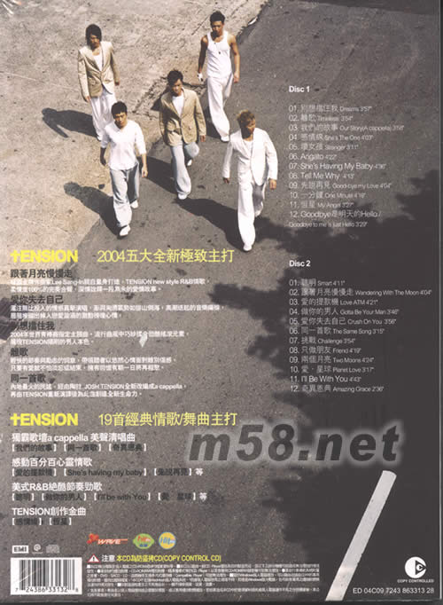 Disc 1 01. 別想擋住我 (New) 2004看世界青棒賽指定主題曲.流行曲風中七妙揉合勁酷搖滾元素,展現TENSION 陽剛的男人本色. 02. 離歌 (New) 輕聲快的節奏與勵志的詞意,帶領聽者以悠然心情面對離別傷感,只要有愛就不怕淡忘或結束,擁有回憶有朝一日將再相聚. 03. 我們的故事 04. 感情線 05. 壞女孩 06. Arigato 07. She's Having My Baby 08. Tell Me Why? 09. 先說再見 10. 一分鐘 11. 恒星 12. Goodbye是明天的Hello Disc 2 01. 聰明 02. 跟著月亮慢慢走 (New) 韓國金牌作曲家LEE SANG-IN親自量身打造,TENSION NEW STYLE P&B 情歌,柔情度100%的完美合聲,深情詮釋一段雋永的愛情故事. 03. 愛的提款機 04. 做你的男人 05. 愛你失去自己 (New) 關注無比投入的情感真摯演唱,澎湃洶涌氣勢如排山倒海,高潮迭起的音樂編排,層層堆砌出掉入戀愛漩渦的激動彷徨心情. 06. 同一首歌 (New) 內地最火的民謠,經由陶(吉吉).JOSH.TENSION全機關報改編成A CAPPELLA,再由TENSION重新演譯后為此曲創造全新生命力. 07. 挑戰 08. 只做朋友 09. 兩個月亮 10. 愛 . 星球 11. I'll Be With you 12. 奇異恩典