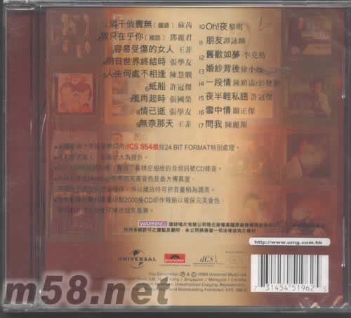 價格為估,以實到貨為準! 20世紀光輝特選17首II(m58.net) 請點看產(chǎn)品正、背面大圖 本碟歌曲之原錄音采用DCS 954機經(jīng)24 BIT FORMAT特別處理。 令動態(tài)更驚人,訊噪比大為提升 加上128倍超值頻取樣,實現(xiàn)了最精密細致的音頻訊號CD錄音 為保留原音(ANALOG)每帶的完美音色及最大傳真度,本唱片不經(jīng)任何壓縮程序,所以播放時可把音量稍為調(diào)高 每卷印模均嚴格限量印制2000支CD即作報銷以確保完美音色,環(huán)球唱片謹此向全球樂迷誠意推薦。