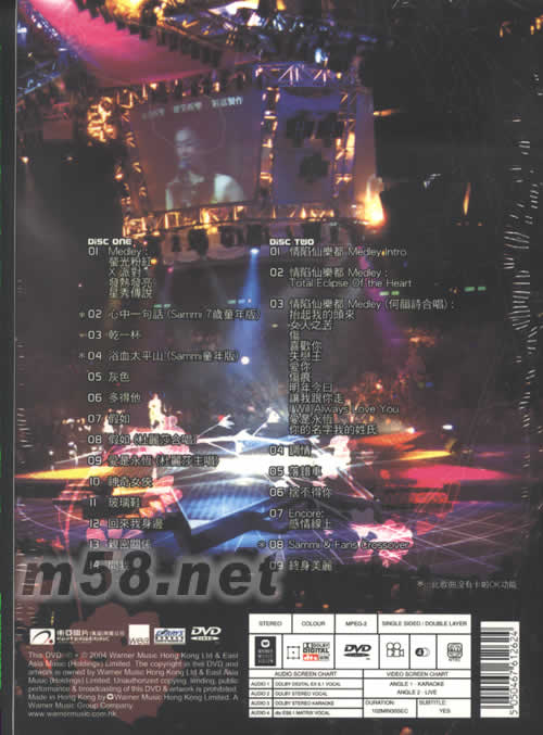 鄭秀文04演唱會LIVE卡拉OK DVD(m58.net) 詳情參數請點看產品正、背面大圖 收錄精彩片段包括: 7歲SAMMI 首度獻唱, 假如SAMMI VS杜麗莎 假如SAMMI VS 何韻詩 舞臺劇初登場“情陷仙樂都: