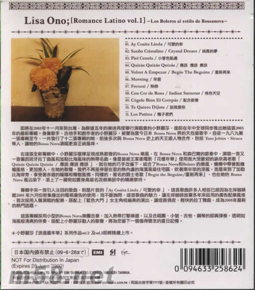 Romance Latino Vol. 1 浪漫嘉年華Vol. 1(m58.net) 2005年期待已久的小野麗莎"Bossa Nova 音樂(lè)之旅"來(lái)到了充滿浪漫風(fēng)情的拉丁嘉年華。邀請(qǐng)到巴西知名的吉他手并且參與過(guò)多數(shù)小野麗莎作品的Oscar Castro Neves 一同參與制作。獨(dú)家收錄臺(tái)灣2005左岸咖啡館廣告曲"Ay Cosita Linda.可愛(ài)的你",重新詮釋納京高經(jīng)典翻唱曲"Quizas Quizas Quizas 應(yīng)該 應(yīng)該 應(yīng)該"以及2首小野麗莎全新創(chuàng)作…等共11首精彩作品!! 即將在2005年十一月來(lái)到臺(tái)灣,為睽違五年的樂(lè)迷再度舉行演唱會(huì)的小野麗莎,提前在年中全球同步推出她這張2005年的最新專輯。身兼歌手、吉他手和創(chuàng)作者的小野麗莎,被譽(yù)為當(dāng)今日本Bossa Nova界的天后級(jí)歌手。自從一九八九第一張專輯至今,一共發(fā)行了十二張專輯的她,前后多次與Bossa Nova史上的天王級(jí)人物合作,包括Tom Jobim、Sivuca等人,讓她的Bossa Nova演唱更添正統(tǒng)風(fēng)味。 在這張全新專輯中,小野麗莎選擇呈現(xiàn)成熟都會(huì)的Bossa Nova樂(lè)風(fēng),在Bossa Nova和森巴舞的節(jié)奏中,演唱一首又一首偏西班牙拉丁曲風(fēng)和加勒比海風(fēng)味的熱帶名曲。像是曾被王家衛(wèi)電影[花樣年華]使用而大受歡迎的納京高老歌[Quizas Quizas Quizas/應(yīng)該 應(yīng)該 應(yīng)該],就在她的巧手改編下,結(jié)合了Bossa Nova和Bolero的樂(lè)風(fēng),慵懶中帶著點(diǎn)嫵媚風(fēng)格,更加撩人,在她的歌聲,我們不再是停留在里約熱內(nèi)盧的海濱高級(jí)住宅區(qū),吹著南半球的涼風(fēng),而是來(lái)到了加勒比海岸旁,享受著赤道的暖陽(yáng)和椰樹(shù)風(fēng)情。同樣的,著名的爵士老歌[Begin the Beguine/重新再來(lái)],也在她的Bossa Nova風(fēng)沾染下,添上了一層宛如置身高級(jí)名流俱樂(lè)部中的精致款待。 專輯中另一首引人注目的歌曲,則是片首的[Ay Cosita Linda/可愛(ài)的你],這首歌曲許多人相信已經(jīng)因?yàn)樽蟀犊Х瑞^2005年六月份密集播出的電視廣告的使用,而不斷詢問(wèn),這首歌曲的魅力,讓左岸咖啡放棄多年來(lái)延用的廣告配樂(lè)風(fēng)格,首次采用人聲演唱的配樂(lè),搭配上[藍(lán)色大門]女主角桂綸美的演出,讓這首俏皮、輕快的拉丁舞曲,成為2005年最新的熱門話題。 這張專輯采用小型的Bossa Nova樂(lè)團(tuán)合奏,加入熱帶打擊樂(lè)器,以及合唱團(tuán)、小號(hào)、吉他、鋼琴的即興彈奏,透明如海風(fēng)般清爽的伴奏,搭配上小野麗莎動(dòng)人的歌聲,將為您留下一個(gè)值得懷念的夏日記憶。