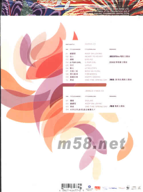 AUDIO CD 01. 繼續(xù)愛 KEEP ON LOVING 02. 貼心 HEART TO HEART /絕世好Bra 電影主題曲 03. 嫌棄 DISLIKE 04. G FOR GIRL /2002演唱會主題曲 05. 荷花 LOTUS 06. 驗光 LYING EYES 07. 西貢小姐 MISS SAI KUNG 08. 煙花匯演 FIREWORKS 09. 喜劇收場 HAPPY ENDING 10. 春逝 ONE FINE SPRING DAY /春逝(香港版)電影主題曲 BONUS VIDEO CD 01. 嫌棄 DISLIKE 02. 繼續(xù)愛 KEEP ON LOVING 03. 春逝 ONE FINE SPRING DAY /春逝 電影主題曲 04. 世界自然(香港)基金會廣告片