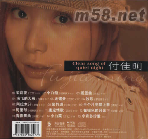 價格為估,以實到貨為準! 靜夜明歌(m58.net) 演唱者付佳明在當今樂壇出色女中音難得一覓的背景下,她那純正美圓潤、有低音頻響的唱腔,其寬廣、飽滿、醇厚的質感,無不讓現場的每一個人驚詫。在交響樂和民樂、人聲伴唱的印襯下,更使得冰冷器材溢滿深情韻味,呈現絕佳聽感。 因為年輕,佳明的聲音少了卻了幾分滄桑,多了一些色彩;因為為自民間的歌謠,那聲音少了幾多沉穩,多了一些開闊,那聲音是值得期待的。