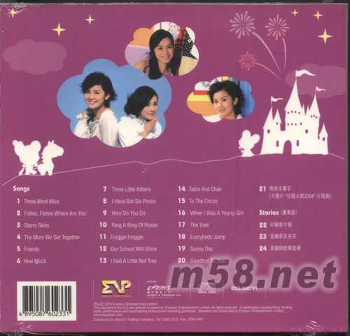 1.Three Blind Mice 2.Fishes,Fishes Where Are You 3.Starry Skies 4.The More We Get Together 5.Friends 6.How Much 7.Three Little Kttens 8.I Have Got Six Pence 9.How Do You Do 10.Ring A Ring Of Roses 11.Froggie Froggie 12.Our School Will Shine 13.I Had A Little Nut Tree 14.Table And Chair 15.To The Circus 16.When I Was A Young Girl 17.The Train 18.Everybody Jump 19.Sunny Day 20.Goodbye To You 21.齊來手牽手(卡通片“哈姆太郎2004”片尾曲) Stories(廣東話) 22.科學家牛頓 23.音樂家貝多芬 24.美國總統(tǒng)華盛頓
