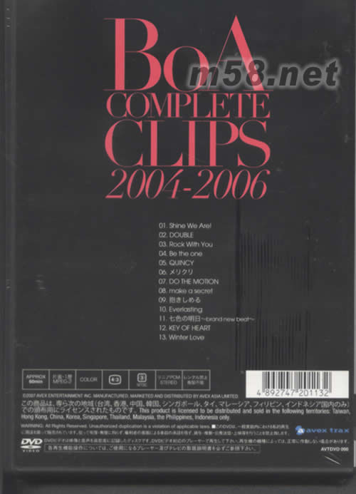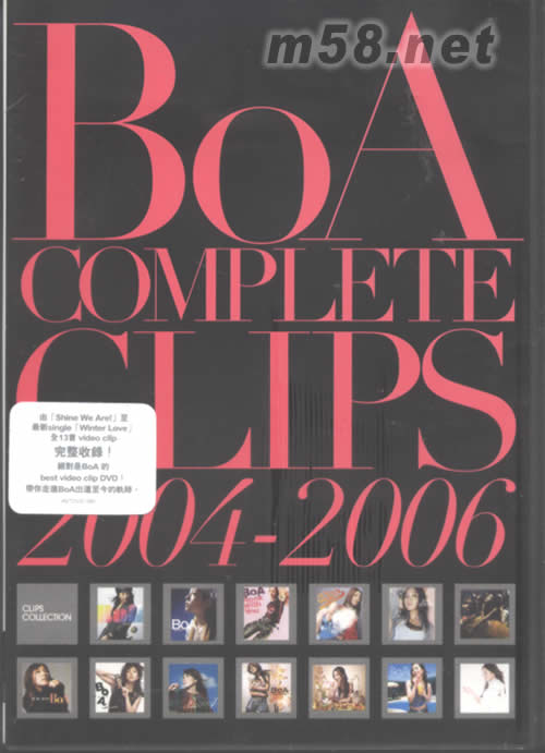 Boa Complete Clips 2004-2006 DVD(海外版)(m58.net) 由[SHINE WE ARE!]至最新SINGLE[WINTER LOVE]全13首VIDEO CLIP 完整收錄! 絕對(duì)是BOA的 BEST VIDEO CLIP DVD! 帶你走進(jìn)BOA出道至今的軌跡.