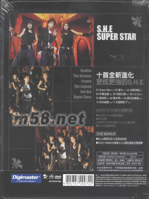 SUPER STAR KARAOKE DVD(m58.net) 隨DVD加送「SUPER STAR 星光燦爛花絮」,內有不少她們最新的訓練及MV制作花絮,更有她們金曲獎感言!此DVD更特別加輯ELLA病房日記及給歌迷的話,還有S.H.E最新CM廣告花絮精華!