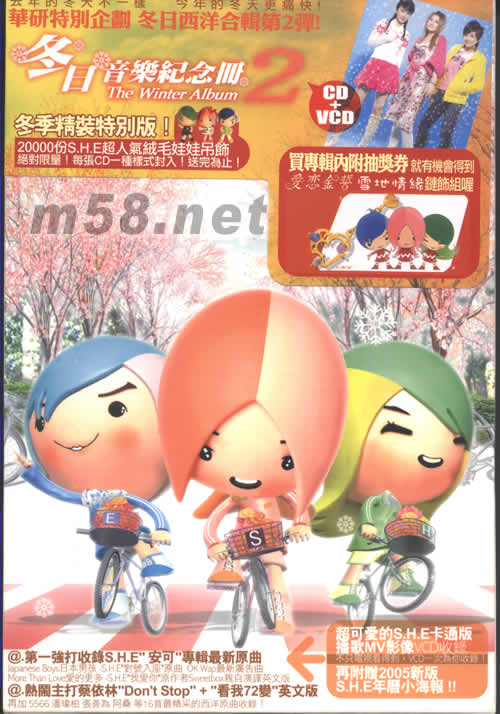 價格為估,以實到貨為準! SELINE娃娃 冬日音樂紀念冊第二集(冬季精裝首批特別版)(m58.net) 請點看產品正、背面大圖。娃娃包裝膜反光圖片有色差屬正常 娃娃約高11CM 產品長*寬*高=21*14.5*4.8CM 產品凈重量250克 20000萬份S.H.E超人氣絨毛娃娃吊飾絕對限量!每張CD一種樣工封入,送完為止. 超可愛的SHE卡通版R播歌MV影像VCD收錄 不只電視看得到,VCD一次為你收錄! 再附贈2005新版SHE年歷小海報! 內附抽獎券有機會得到愛戀金誓雪一情緣鏈飾組!