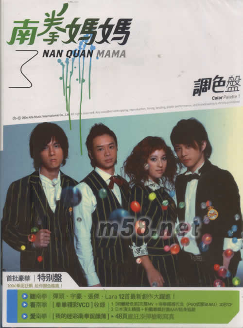價(jià)格為估,以實(shí)到貨為準(zhǔn)! 調(diào)色盤(臺(tái)灣首批豪華 特別盤)(m58.net) 聽南拳[彈頭、宇豪、張杰、LARA12首最新創(chuàng)作大躍進(jìn)!] 看南拳[拳拳精彩VCD]收錄: 1、[初戀粉色系]完整MV+南拳媽媽代信(PGO低腰BUBU)30秒CF 2、日本演出精選+折攝專輯封面 MV貼身追蹤 愛南拳[我的迷彩南拳留顏簿]48頁瘋狂漆彈槍戰(zhàn)寫真 調(diào)青春的顏色 調(diào)成長(zhǎng)的苦澀 調(diào)音樂的琴瑟 [初戀粉色系]:(PGO低腰BUBU)年度廣告主題曲南拳媽媽獨(dú)門青澀情歌 [TONIGHT]:回憶,因?yàn)橛心愣暾?006最感動(dòng)的離別之歌 [離家不遠(yuǎn)]:寫給親人的情歌,南拳媽媽最深刻的抒情佳作(2006錢柜星秀選拔賽)活動(dòng)主題曲 [槍與玫瑰]:如果音樂是武器,戰(zhàn)爭(zhēng)變美麗!英式搖滾與HIP-HOP完美結(jié)合