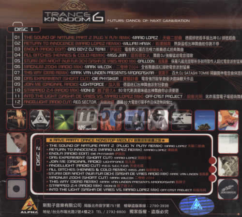 CD2 Rave Party Dance Nonstop Medley 銳舞派對連續組曲 1. The Sound Of Nature Part 2 (Plug ‘N’ Play Remix)– Mario Lopez 天籟二部曲 2. Return To Innocence (Mario Lopez Remix)– William Hawk 返璞歸真 3. Enola (Radio Edit)– Bad Boyz DJ Team 伊諾拉 4. Das Experiment (Short Cut) – Die Physiker 實驗計畫 5. Join Me (Original Radio)– Lightforce 加入我 6. Angellight (Radio Cut)– R.E.D. S.E.C.T.O.R. 天使光環 7. All Bitches (Hennes & Cold Remix)– Miss JMA 這些壞女人 8. Sturm Der Nacht (Nur Fur Dich) (Sasha De Vries Radio Mix)– Marc Van Linden 夜風暴 9. Magnum 2004 (Short Cut)– Mark Wilcox二夸特 2004 10. This Way (Derb Remix)– Mark Van Linden Presents Madagaskar 就降子 11. Stripped 2.4 (Radio Mix)– Moni B 脫了吧2.4 12. Into The Light (Sasha De Vries vs. Mario Lopez Mix)– Off-Cast Project前進光明