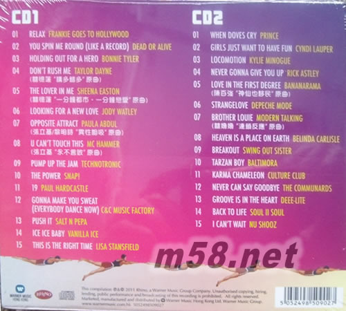 CD1 01.Relax -Frankie Goes To Hollywood 02.You Spin Me Round(Lide A Record) -Dead Or Alive 03.Holding Out For A Hero -Bonnie Tyler 04.Don’t Rush Me -Taylor Dayne (林憶蓮“度多錯多”原曲) 05.The Lover In Me -Sheena Easton (林憶蓮“一分鐘都市.一分鐘戀愛”原曲) 06.Looking For A New Love -Jody Watley 07.Opposite Attract -Paula Abdul (張立基/黎明詩“異性相吸”原曲) 08.U Can’t Touch This -Mc Hammer (張立基“永不言敗”原曲) 09.Pump Up The Jam -Technotronic 10.The Power -Snap! 11.19 -Paul Hardcastle 12.Gonna Make You Sweat -C&C Music Factory 13.Push It -Salt N Pepa 14.Ice Ice Baby -Vanilia Ice 15.This Is The Right Time -Lisa Stansfield CD2 01.When Doves Cry -Prince 02.Girls Just Want To Have Fun -Cyndi Lauper 03.Locomotion -Kylie Minogue 04.Never Gonna Give You Up -Rick Astley 05.Love In The First Degree -Bananarama(陳百強“神仙也移民”原曲) 06.Strangelove -Depeche Mode 07.Brother Louie -Modern Talking(林姍姍“連鎖反應”原曲) 08.Heaven Is A Place On Earth -Belinda Carlisle 09.Breakout -Swing Out Sister 10.Tarzan Boy -Baltimora 11.Karma Chameleon -Culture Club 12.Never Can Say Goodbye -The Communards 13.Groove Is In The Heart -Deee-Lite 14.Back To Life -Soul II Soul 15.I Can’t Wait -Nu Shooz