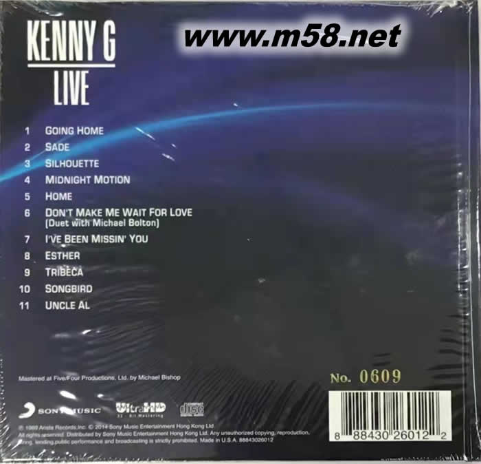 LIVE 回家 ULTRAHD 限量版(m58.net) Sony Music Hong Kong與FIM (First Impression Music) 合作之經典名盤. 全部母帶Re-mastering及壓碟過程均在美國處理, 每款CD附有詳盡Precision Replication Report 測試報告, 製作嚴謹, 高質原音表現! 每款首批1,000張, 特別印有獨立編號更顯珍貴! 這是一張絕對的示范級錄音,不但Saxophone的音色靚到絕,現場效果也屬千中無一!這是可以跟Carnegie Hall頂級live錄音一較高下的超卓Hi-Fi錄音制作。全部錄音都充滿生氣,令人投入,Kenny G的演奏是他個人最佳的一次,每每表現他的「長氣神功」,令人嘆服,這是三兩最佳爵士樂錄音之一,當然是非擁有不可了。我最喜歡用《Songbird》示范,這數分鐘的效果表現有能力把組合發揮到極限,令聽者留下深刻的印象。 備注:論吹奏色士風的高手多不勝計,但以流行曲 中最負盛名的色士風高手則非Kenny G莫屬。在其眾多的錄音之中,最悠久及最具代表性的就肯定是其《Livie》一碟。Show Quali式的演奏技巧,令人拍案叫絕,如看過其同名大碟之影碟版則更肯定所言非虛。碟內共異乎尋常11首樂曲,最標青者分別是track 1、3、5、8、10及11。除樂曲的旋律優美外錄音亦極之出色,無論是Alto Saxophone抑或Tenor Saxophone的質感,照樣錄得出色,是流行曲錄音中,少有的代表作。發燒友常以track 1來試器材的弱音再生能力,那枝被Kenny G 吹到會拐彎的Alto Saxophone,在2分3秒后的25秒演奏片段,可測試器材的分析力。如果你的器材夠班,將可感受到其中的微妙變化。而track 10的Songbird,色士風的質感收錄得最為出色,金屬質感表露無遺,偶爾的一兩下低頻抽南亦異常嚇人。