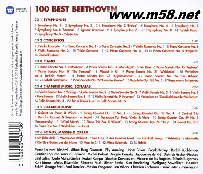 100 BEST BEETHOVEN 100 貝多芬百分百 6CD套裝(m58.net) 貝多芬是真正堪稱「樂圣」而無愧的一個(gè)人。「圣」就是「極致」,只能被發(fā)揚(yáng)、傳承或衍生,不可能被超越或取代;至今貝多芬仍是支持整個(gè)西方音樂體系的主要巨干。大部份近代的音樂潮流和思想,從布拉姆斯、華格納到荀貝格,從管弦樂法到鋼琴流派,都可追溯和貝多芬的源流關(guān)係。 貝多芬的創(chuàng)作時(shí)期約可以分成三個(gè)時(shí)期:第一個(gè)時(shí)期是對(duì)前輩海頓、莫札特的模仿期,代表作有第一號(hào)交響曲、早期鋼琴奏鳴曲;第二時(shí)期是到1814年的盛年期,作品充滿力度和熱情,例如著名的《命運(yùn)》、《英雄》、《田園》交響曲,《熱情》、《悲愴》、《熱情》奏鳴曲……等。晚年作品充滿深沉的人生歷練,作品宏偉而富有前瞻性,如《合唱》交響曲、《莊嚴(yán)彌撒》、后期弦樂四重奏……等。 貝多芬兩百五十週年冥誕將至,華納音樂發(fā)行這一套選出貝多芬最佳百軌音樂的選集。除了從EMI自1950年代后期一直到1990年代的錄音中,精心選出最能代表貝多芬風(fēng)格的音樂,第八號(hào)鋼琴奏鳴曲《悲愴》、小提琴協(xié)奏曲、第五號(hào)鋼琴協(xié)奏曲《皇帝》、第五號(hào)小提琴奏鳴曲《春》都是完整收錄,讓愛樂者在有限的時(shí)間里,仍有機(jī)會(huì)更全面了解貝多芬。其他演出者包括:艾馬爾、貝爾格弦樂四重奏、愛默玲、珍娜‧貝克、布赫賓德、高提耶‧卡普松、雷諾‧卡普松、杜普蕾、費(fèi)雪狄斯考、朱里尼、肯培、柯瓦謝維契、安赫麗絲、盧岡斯基、馬舒、慕提、拉圖、桑德林、薩瓦利希、海因里希‧席夫、塞爾、托特里葉、凡格洛夫、扎哈里埃、齊默曼等人。
