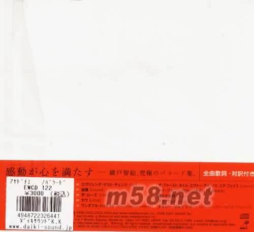 BALLADS CHIE AYADO(10周年紀念盤日本版)(m58.net) 日本爵士女聲,綾戶智繪,出道十周年精選大碟,收錄15首精彩傷口包括;AMAZING GRACE,YOU SONG ,THE WAY WE WERE LOVE MY WAY TENNESSEE WALTZ等等,首首經(jīng)典名曲,原裝日本版人聲細致自然。