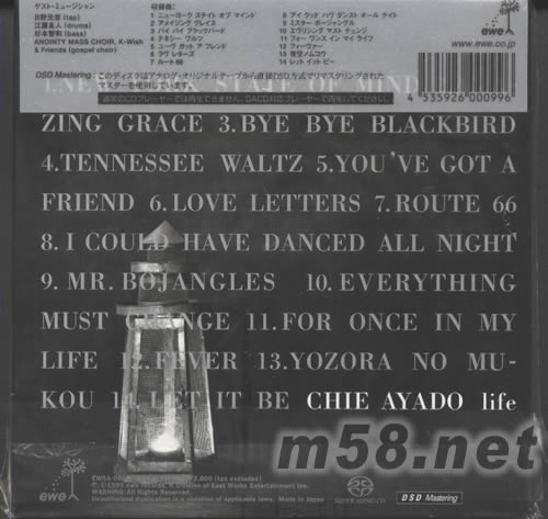LIFE (日本版)(m58.net) 詳情參數請點看產品正、背面大圖 日本當今最人氣女歌手綾戶智繪代表名作之一”LIFE“,選唱多首經典名曲”TENNESSEE WALTZ“以輕輕的琴韻襯托出感人的歌聲,從演繹中散發出非凡的魅力。話題之作”FEVER“,低潛的牛盤與歌聲與天作之合,無論演繹或錄音達頂級示范之作。“LET IT BE ”讓歌者與合唱團流露出真情的一面。原裝進口,發燒人聲的典范之作。