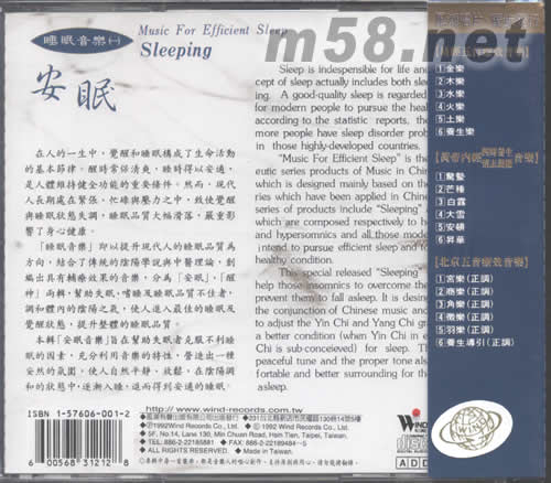 安眠SLEEPING(m58.net) 請點看產品正、背面大圖 提升睡眠品質的音樂處方 在人的一生中,覺醒和睡眠構成了生命活動的基本節律。醒時常保清爽,睡時得以安適,是人體維持健全功牟的重要條件。然而,現代人長期處在緊張,忙碌壓力之中,致使覺醒與睡眠狀態失調,睡眠品質大幅滑落,嚴重影響了身心健康。 [睡眠音樂]即以提升現代人的睡眠品質為方向,結合了伎的陰陽學說與中醫理論,創編出具有輔療效果的音樂,分為[安眠][醒神]兩輯,幫助失眠、嗜睡及睡眠品質不佳者,調和體內的陰陽之氣,使人進入最佳的睡眠及覺醒狀態,提升整體的睡眠品質。 本輯[本眠音樂]旨在幫助失眠者克服不利睡眠的因素,充分利用音樂的特性,營造出一種安然的氛圍,使人自然平靜、放松,在陰陽調和的狀態中,逐漸入睡,進而得到安適的睡眠。