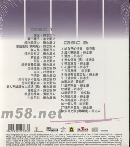 DISC 1 1、爛泥--許志安 2、愛不釋手--李克勤 3、越吻越傷心--蘇永康 4、會過去的(獨唱版)--許志安 5、無人島--黃凱芹 6、情來自有方---蘇永康 7、窮爸爸--許志安 8、飛花--李克勤 9、請將音量收細---蘇永康 10、走的漂亮--許志安 11、走火---杜德偉 12、平均分--蘇永康 13、如何可以不愛她--許志安 14、想你的舊名字--李克勤 15、男人不該讓女人流淚--蘇永康 16、青蛙王子--許志安 17、希望你快樂--黃凱芹 18、生命色彩--蘇永康 DISC 2 1、給自已的情書--李克勤 2、燈光欄跚處--蘇永康 3、愛你--許志安 4、無心傷害--杜德偉 5、獨立宣言--蘇永康 6、心靈相通--許志安 7、在我身邊---李克勤 8、假使有日能忘記--蘇永康 9、日落旅館--許志安 10、難忘記--黃凱芹 11、眉來眼去--蘇永康 12、讓愛--許志安 13、進退兩男---李克勤 14、海國天崖--蘇永康 15、及時趕到--許志安 16、一個人飛---李克勤 17、從來末發生---蘇永康 18、安哥之歌-(獨唱版)--許志安
