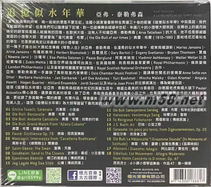追憶似水年華A La Recherche du Temps Passe(m58.net) 當不能擁有的時候,唯一能做的便是不要忘記」~普魯斯特 挪威國寶級小提琴大師亞弗.泰勒弗森生涯最美的精選輯老虎魚唱片旗下Pauler Acoustics精心后制展現「鬼斧神工」的錄音技藝! 當不能擁有的時候,唯一能做的便是不要忘記」法國小說家普魯斯特在長達三十卷的巨著《追憶似水年華》中如是說。我們不能讓時光停留,但是我們可以選擇留下記憶。對一位縱橫舞臺超過半世紀,年過八十的小提琴大師來說,在舞臺上的歲月與精彩的錄音就是讓人能擁有的回憶。在歐洲大陸,沒有人不知道亞弗.泰勒弗森(Arve Tellefsen)的大名,他不但是挪威國寶級的小提琴大師,更被譽為「當代奧雷.布爾」(the Ole Bull of our times)。奧雷.布爾(1810–1880)是帕格尼尼最知名的學生,也是挪威有史以來最偉大的小提琴家。 前一陣子才推出80大壽紀念專輯《琴影人生》的亞弗.泰勒弗森,在漫長的似水年華中,經常與楊頌斯(Mariss Jansons)、Arvid Jansons、布隆斯泰特(Herbert Blomstedt)、貝爾提尼(Gary Bertini)、Evgeny Svetlanov、Bryden Thomson、賈維(Neeme Jarvi)、沙隆年(Esa-Pekka Salonen)、Paavo Berglund、阿胥肯納吉(Vladimir Ashkenazy)、Walter Weller以及祖賓梅塔(Zubin Mehta)這些世界級指揮同臺演出。在英國期間,則長期與皇家愛樂(Royal Philharmonic)、倫敦愛樂(London Philharmonic)以及皇家蘇格蘭國家管弦樂團(Royal Scottish National Orchestra)合作。 亞弗.泰勒弗森更一手籌辦了奧斯陸室內音樂節(Oslo Chamber Music Festival),邀請舉世聞名的音樂家Anne Sofie von Otter、Barbara Hendricks、Jan Garbarek、Leif Ove Andsnes、Yuri Bashmet、Mischa Maisky、Gidon Kremer、Angela Hewitt、Hagen Quartet、Hilliard Ensemble、Jordi Savall以及Maria Joao Pires前往挪威演出,傳為樂壇佳話。 這張《追憶似水年華》從亞弗.泰勒弗森超過半世紀的演藝生涯中,精選出最美的18首曲目,由德國老虎魚唱片旗下Pauler Acoustics精心后制,還原最完美的音質。除了亞弗.泰勒弗森最拿手的獨奏小品之外,也有與管弦樂團合作的大編制協奏曲,更收錄了多首難得一聞的奧雷.布爾作品,琴音優美,曲曲動聽,正如同普魯斯特在《追憶似水年華》所說「有回憶才是完美人生」,這張《追憶似水年華》為大師琴藝留下最完美的紀錄。
