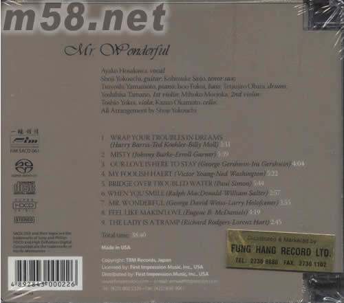 TO Mr WONDERFUL SACD(m58.net) 日本當(dāng)代首席爵士天后細(xì)川綾子, 是位血統(tǒng)純正的日本女歌手細(xì)川綾子。那么為什么她的唱腔洋味十足,咬字吐音完全象歐美歌手昵?原因很簡(jiǎn)單,因?yàn)樗龔男≡诿绹?guó)長(zhǎng)大。 她的作品錄音和編曲一樣高品位,音色鮮活濃艷,定位感之強(qiáng)烈更叫人瞠目結(jié)舌