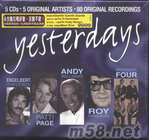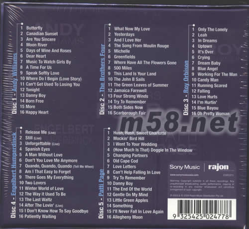 DiSc1 - Andy Williams 1.Butterfly 2.Canadian Sunset 3.Are You Sincere 4.Moon River 5.Days of Wine And Roses 6.Dear Heart 7.Music To Watch Girls By 8.A Time For Us 9.Speak Softly Love 10.Where Do I Begin (Love Story) 11.Can't Get Used To Losing You 12.Tonight 13.Danny Boy 14.Born Free 15.More 16.happy Heart Disc2 - The Brothers Four 1.What Now My Love 2.yesterdays 3.And I Love Her 4.the Song From Moulin Rouge 5.Michelle 6.Greenfields 7.Where have All The Flowers Gone 8.500 Miles 9.This Land Is Your Land 10.The John B Sails 11.The Green Leaves of Summer 12.jamaica Farewell 13.Four Strong Winds 14.Try To Remember 15.Both Sides Now 16.Scarborough Fair Disc3 - Roy Orbison 1.Only The Lonely 2.Leah 3.In Dreams 4.Uptown 5.It's Over 6.Crying 7.Dream Baby 8.Blue Angel 9.Working For The Man 10.Candy Man 11.Running Scared 12.Falling 13.Love Hurts 14.I'm hurtin 15.Blue Bayou 16.Oh pretty Woman Disc4 - Engelbert Humperdinck 1.Release Me(Live) 2.Still(Live) 3.Unforgettable(Live) 4.Spanish Eyes 5.A Man Without Love 6.Don't You Love Me Anymore 7.Quando,Quando,Quando(Tell Me When) 8.Am I That Easy To Forget 9.There Goes My Everything 10.Two Lovers 11.Winter World of Love 12.The way it used To Be 13.The Last Waltz 14.After The Lovin'(Live) 15.I Don't Know how To Say Goodbye 16.patiently Waiting Disc5 - Patti Page 1.Hush,Hush,Sweet Charlotte 2.Mockin'Bird Hill 3.I Went To Your Wedding 4.(How Much Is That)Doggie In The Window 5.Changing Partners 6.Old Cape Cod 7.Love Letters 8.Can't help Falling In Love 9.Try To Remember 10.Danny Boy 11.The End Of the World 12.Gentle On My Mind 13.Little Green Apples 14.Something 15.I'll Never Fall In Love Again 16.Allegheny Moon
