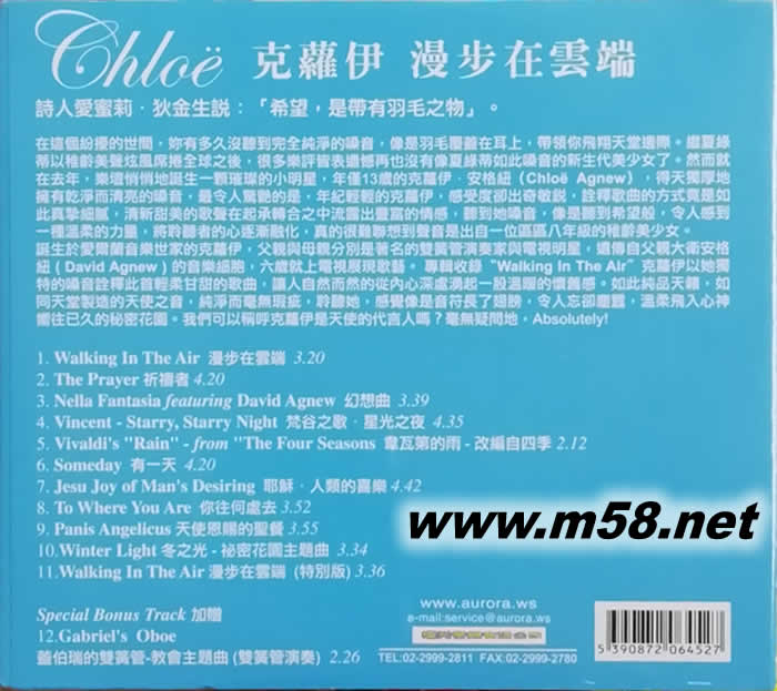 WALKING IN THE AIR漫步在云端(m58.net) 在這個紛擾的世間,你有多久沒聽到完全純凈的嗓音,像是羽毛覆蓋在耳上,帶領你飛翔天堂邊際。繼夏綠蒂以稚齡美聲炫風席卷全球之后,很多樂評皆表遺憾再也沒有像夏綠蒂如此嗓音的新生代美少女了。然而就在去年,樂壇悄悄地誕生一顆璀璨的小明星,年僅13歲的克蘿伊·安格紐(Chloe Agnew),得天獨厚地擁有干凈而清亮的嗓音,最令人驚艷的是,年紀輕輕的克蘿伊,感受度卻出奇敏銳,詮釋歌曲的方式竟是如此真摯細膩,清新甜美的歌聲在起承轉合之中流露出豐富的情感,聽到她嗓音,像是聽到希望般,令人感到一種溫柔的力量,將聆聽者的心逐漸融化,真的很難聯想到聲音是出自一位區區八年級的稚齡美少女。 誕生于愛爾蘭音樂世家的克蘿伊,父親與母親分別是著名的雙簧管演奏家與電視明星,遺傳自父親大衛安格紐(David Agnew)的音樂細胞,六歲就上電視展現歌藝。專輯收錄"Walking In The Air"克蘿伊以她獨特的嗓音詮釋此首輕柔甘甜的歌曲,讓人自然而然的從內心深處涌起一股溫暖的懷舊感。如此純品天籟,如同天堂制造的天使之音,純凈而毫無瑕疵,聆聽她,感覺像是音符長了翅膀,令人忘卻塵囂,溫柔飛入心神向往已久的秘密花園。我們可以稱呼克蘿伊是天使的代言人嗎?毫無疑問地,Absolutely!