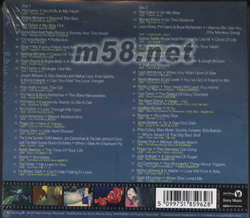 DISC 1 1、PHIL COLLINS ——YOU'LL BE IN MY HEART (電影TARZAN 泰山) 2、ROBBIE WILLIAMS ——BEYOND THE SEA (電影:FINDING NEMO海底奇兵) 3、PHIL COLLINS ——NO WAY OUT (電影:BROTHER BEAR 熊之歷險) 4、CELINE DION AND PEABO BRYSON——BEAUTY AND THE BEAST (電影:BEAUTY AND THE BEAST 美女與野獸) 5、CHRISTINA AGUILERA——REFLECTION (電影MULAN花木蘭) 6、STING——MY FUNNY FRIEND AND ME (電影EMPERO‘S NEW GROOVE 騎呢大帝) 7、VANESSA WILLIAMS——COLORS OF THE WIND (電影POCAHONTAS 風中奇緣) 8、PEABO BRYSON®INA BELLE—— A WHOLE NEW WORLD (電影ALADDIN阿拉?。?br>9、PHIL COLLINS——STRANGER LIKE ME(電影TARZAN泰山) 10、JOSEPH WILLIAMS &SALLY DWORSKY WITH NATHAN LANE, ERNIE SABELLA,&KRISTIE EDWARDS---CAN YOU FEEL THE LOVE TONIGHT (電影LION KING 獅子王) 11、PETER ANDRE ---KISS THE GIRL (電影LITTLE MERMAID 小魚仙) 12、PHIL HARRIS &BRUCE REITHERMAN_THE BARE NECESSITIES (電影JUNGIE BOOK 小泰山) 13、PHIL HARRIS——EVERYBODY WANTS TO BE A CAT (電影ARISTOCATS 富貴貓) 14、PHIL COLLINS ——LOOK THROUGH MY EYES(電影BROTHER BEAR熊之歷險) 15、LOUIS ARMSTRONG——BIBBIDI BOBBIDI BOO (電影THE CINDERELLA 仙履奇緣) 16、PEGGY LEE——HE’S A APRIL SHOWER (電影LADY AND THE TRAMP小姐與流氓) 17、DISNEY CHOIR ——LITTLE APRIL SHOWER (電影BAMBI小鹿斑比) 18、THE CROW QUINTEL:CLIFF EDWARDS ,JIM CARMICHAEL&THE HALL JOHNSON CHOIR AND THE WALT DISNEY STUDIO ORCHESTRA---WHEN I SEE AN ELEPHANT FLY (電影DUMTO小飛象) 19、RANDY NEWMAN——THE TIME OF YOUR LIFE (電影BUG‘S LIFE 蟲蟲特工隊) 20、ETERNAL——SOMEDAY (電影HUNCHBACK OF NOTRE DAME鐘樓駝俠) 21、TINA TURNER——HE LIVES IN YOU (電影LION KING 2 獅子王2) 22、F4(BONUS TRACK)——CAN’T HELP FALLING IN LOVE (電影LILO AND STITCH 扮野小魔星) DISC 2 1、PHIL COLLINS ——ON MY WAY (電影院TAZAN泰山) 2、MICHAEL BOLTON ——GO THE DISTANCE (電影HERCUIES大力士) 3、LOUIS PRIMA,PHIL HARRIS&BRUCE REITHEMAN_I WANNA BE LIKE YOU (THE MONKEY SONG) (電影JUNGLE BOOK小泰山) 4、CARMEN TWILLIE AFRICAN VOCAL PERFOMED BY LEBO M---CIRCLE OF LIFE (電影獅子王) 5、98 DEGREES AND STEVIE WONDER——TRUE TO YOUR HEART (電影MULAN 花木蘭) 6、SAMUEL E WRIGHT——UNDER THE SEA (電影LITTLE MERMAID小魚仙) 7、NATHAN LANE,ERNIE SABELLA ,JASON WEAVER&JOSEPH WILLIAMS_HAKUNA MATATA (電影獅子王) 8\LOUIS ARMSTRONG_WHEN YOU WISH UPON A STAR (電影木偶奇遇記) 9、YOU‘VE GOT A FRIEND IN ME (反斗奇兵) 10、KENNY LIGGINS——YOUR HEART WILL LEAD YOU HOME(小熊維尼友情歷險記) 11、FESS PARKER THE BALLAD OF DAVY CROCKETT (電影大衛 克羅傳) 12、HEITH ——HO (電影白雪公主與七個小矮人) 13、I’LL TRY (電影飛越夢幻島) 14、BOYZON SHOOTING STAR (電影大力士) 15、ZIP A DEE DOO DAH(南方之歌) 16、PINTO COLVIG MARY MODER DOROTHY COMPTON BILY BLETCHER WHO‘S AFRAID OF THE BIG BAD WOLF(電影三只小豬) 17、MICKEY MOUSE MARCH(米老鼠俱樂部) 18、THE SIAMESE CAT SONG(電影小姐與流氓) 20、THE WONDERFUL THING ABOUT TIGERS (JNJY小熊維尼友情歷險記) 21、LOVE WILL RIND A WAY (電影獅子王2) 22、WHEN SHE LOVED ME(電影反斗奇兵2)