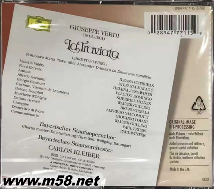 威爾第:茶花女 Carlos Kleiber - Verdi: La traviata 大禾花版 劉漢盛推介(m58.net) 由卡羅斯?克萊伯指揮德國巴伐利亞國民歌劇院管弦樂團與合唱團演奏錄制的《威爾第:茶花女》CD,2009年的《企鵝古典唱片指南》中推薦為三星。 三幕歌劇《茶花女》,是皮亞韋根據小仲馬的著名小說《茶花女》改編,這張卡羅斯?克萊伯的《威爾第:茶花女》發行于歐洲。1852年,威爾第在短短1個月內,完成全部作曲工作。1853年3月6日,于威尼斯的鳳凰劇院首次公演不幸失敗。失敗的原因大致有:(1)飾演薇奧麗特的歌手,胖得像只肥豬,到終幕演至因肺病垂危時,更為不當,惹得哄堂大笑。(2)男主角歌手因感冒聲音欠佳。(3)其它歌手排練不足。(4)巴黎的社交舞臺,對歌手和聽眾,都太陌生。但是新聞批評并不壞,說歌手演出雖然欠理想,然而音樂卻非常美妙。次年在同地圣培德劇院再演時,就起用苗條的女高音,布景與服裝都改為路易十三時的款式;同時音樂也稍加潤飾,終于獲得非凡的成功。從此以后《茶花女》即流傳各國,備受贊賞,盛演不衰,成為一部在歌劇史上具有一流水平的上乘之作。 傳奇指揮卡羅斯?克萊伯(Carlos Kleiber)于2004年7月13日的逝世,不僅只是愛樂者痛失了一個偉大的指揮家,也代表了音樂史上最后一個充滿具風格與魅力的時代的結束。