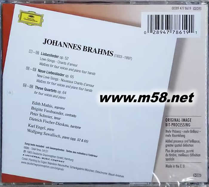 布拉姆斯 : 情歌圓舞曲、新情歌圓舞曲、三首四重唱Brahms : Liebeslieder-Walzer, Quartette 大禾花版(m58.net) EDITH MATHIS 法斯賓德,次女高音/費雪狄斯考,男中音/瑪蒂絲,女高音/許萊亞,男高音/薩瓦利希,鋼琴/恩格爾,鋼琴 從1863年出任維也納歌唱學院董事開始,布拉姆斯創作大量的合唱曲,編制從伴奏到阿卡貝拉都有,其中1870年首演,以人聲四重唱加上鋼琴四手聯彈寫成的《情歌圓舞曲》,以及五年后完成的《新情歌圓舞曲》最受歡迎。共計三十三首歌曲的《情歌圓舞曲》與《新情歌圓舞曲》的歌詞取自德國詩人、哲學家道默爾的譯作,他把俄羅斯、波蘭、匈牙利,甚至是土耳其、馬來地區……等的民謠歌詞翻譯為德文。 這張專輯錄製於1981年,一出版就因為真實而且有臨場感的錄音效果,被《企鵝評鑑》評為DG錄製最成功的專輯之一。法斯賓德、費雪狄斯考、瑪蒂絲、許萊亞四名聲樂家的聲音旗鼓相當,不但足以詮釋出各個聲部的色彩、風格與細節,彼此間也能如室內樂音樂家般的水乳交融。再加上薩瓦利希與恩格爾的鋼琴演奏,在在使得它在同曲目間,找不出足以與之匹敵的錄音,是一張相當吸引人的聲樂專輯。