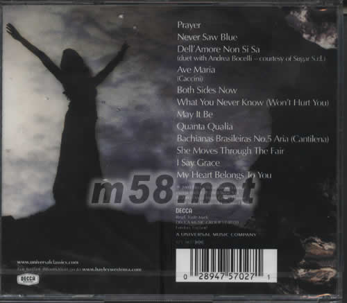 01. Prayer 02. Never Saw Blue 03. Dell'Amore Non Si Sa (duet with Andrea Bocelli-courtesy of Sugar S.r.l.) 04. Ave Maria(Caccini) 05. Both Sides Now 06. What You Never Know(Won't Hurt You) 07. May It Be 08. Quanta Qualia 09. Bachianas Brasileiras No.5 Aria(Cantilena) 10. She Moves Through The Fair 11. I Say Grace 12. My Heart Belongs To You