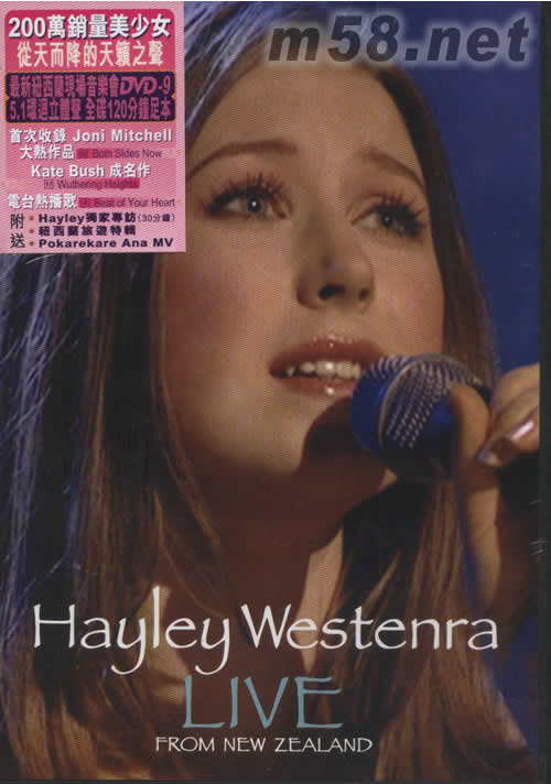 HAYLEY WESTENRA LIVE FROM NEW AEALAND(新西蘭演唱會DVD)(m58.net) 200萬銷量美少女 從天而降的天籟之聲 最新紐約西蘭現場音樂會DVD-9 5.1環回體聲 全碟120分鐘足本 首次收錄JONI MITCHELL 大熱作品 BOTH SIDES NOW KATE BUSH 成名作 17 WUTHERING HEIGHTS 電臺熱播歌6 BEAT OF YOUR HEART 付送 HAYLEY獨家專訪(30分鐘) 紐西蘭旅游特輯 POKAREKARE ANA MV