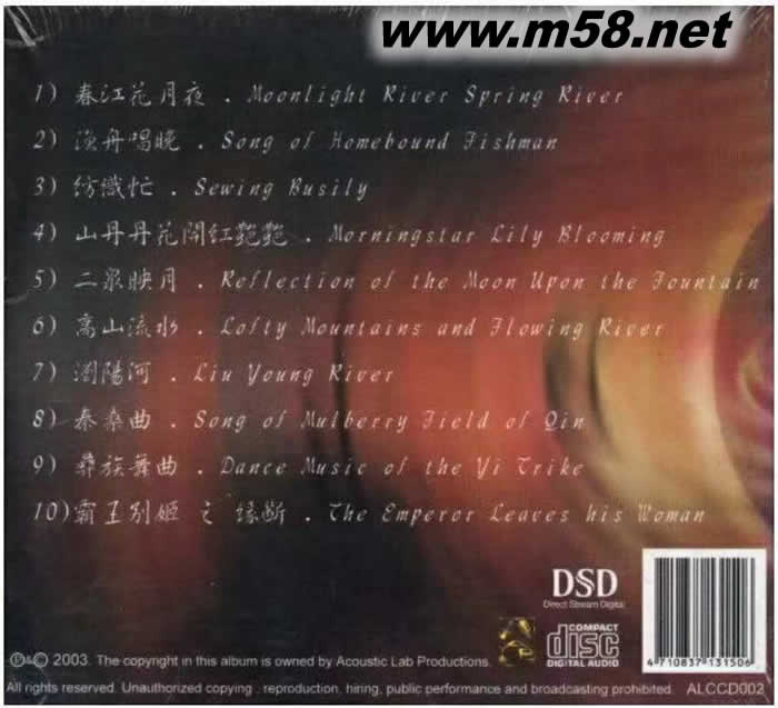 1、春江花月夜/MOONLIGHT RIVER SPRING RIVER 2、漁舟唱晚/SONG OF HOMEBOUND FISHMAN 3、紡織忙/SEWING BUSILY 4、山凡凡花開紅艷艷/MORNINGSTAR LILY BLOOMING 5、二泉映月/REFLECTIN OF THE MOON UPON THE FOUNTAIN 6、高山流水LOFTY MOUNTAINS AND FLOWING RIVER 7、瀏陽河/AIU YOUNG RIVER 8、泰桑曲/SONG OF MULBERRY FIELD OF QIN 9、彝族舞曲/DANCE MUSIC OF THE YI TRIKE 10、霸王別姬之緣斷/THE EMPEROR LEAVES HIS WOMAN