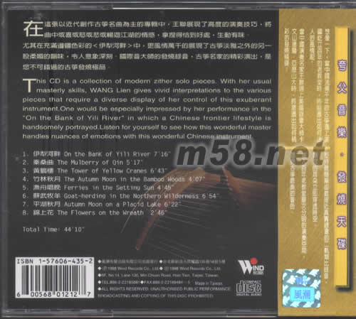 1、伊犁河畔 ON THE BANK OF YILI RIVER 2、秦桑曲 THE MULBERRY OF QIN 3、黃鶴樓 THE TOWER OF YELLOW CRANES 4、竹林秋月 THE AUTUMN MOON IN THE BAMBOO WOODS 5、漁舟唱晚 FERRIES IN THE SETTING SUN 6、蘇武牧羊 GOAT-HERDING IN THE MORTHERN WILDERNESS 7、平湖秋月 AUTUMN MOON ON A PLACID LAKE 8、錦上花 FLOWERS ON THE WREATH