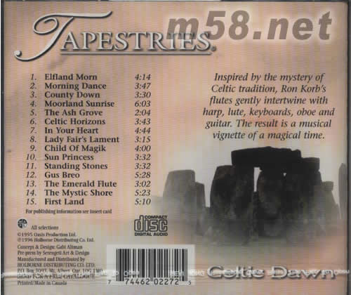價格為估,以實到貨為準! CELTIC DAWN凱爾特的黎明(m58.net) MADE IN CANADA 受凱爾特神秘的傳統文化影響,著名的長笛吹奏家朗·科伯以其擅長的長笛,伴以豎琴、雙簧管、吉他和電子合成器等樂器,演出美妙浪漫并極富民族特色的樂曲
