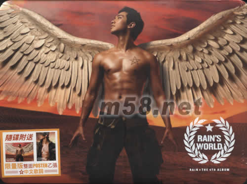 RAIN‘S WORLD(香港預(yù)購(gòu)版)(m58.net) 隨碟海報(bào)尺寸: 76*51CM 魅力襲卷全亞洲并朝全世界進(jìn)軍的韓國(guó)小天王--Rain鄭智熏,睽違二年終于推出全新第四張韓文專輯“Rain's World”。從2002年出道至今短短數(shù)年間,不僅發(fā)行過(guò)“初雨First Drop”“Rain 2”“It's Raining”等三張韓文專輯,成功進(jìn)軍日本發(fā)行日文專輯“It's Raining”“Eternal Rain”與日文單曲「Sad Tango」、「Free Way」,也有了第一張中文單曲「手記」,成為多聲帶的歌唱藝人,更隨著韓劇「浪漫滿屋」的成功,使得Rain在短短二年時(shí)間內(nèi),成功襲卷全亞洲,成為演歌雙棲的韓國(guó)優(yōu)秀藝人代表。打從2002年出道當(dāng)年,Rain即囊括韓國(guó)所有大型音樂(lè)類票選最佳新人歌手獎(jiǎng),2004年開(kāi)始戲劇的演出,也迅速憑著他優(yōu)異的演技,獲得當(dāng)年韓國(guó)所有電視臺(tái)年終頒獎(jiǎng)的演技大賞,2006年,Rain的超高人氣更獲選為Time時(shí)代雜志百大影響力人物。 不同于前三張專輯的概念,全新的個(gè)人第四張韓語(yǔ)專輯里,Rain要將“和平”的主題傳達(dá)給全世界的人們,封面的Rain以戰(zhàn)勝惡魔的天使為主題,裸露的上半身配上軍長(zhǎng)褲站在寬闊的沙漠上,毫不吝嗇地展示他一身古銅色的結(jié)實(shí)肌肉,巨大的白色羽翼傳達(dá)著Rain要保護(hù)世人的意念。新專輯“Rain’s World”的封套概念是采用Rain的提議,他希望透過(guò)「雨」這項(xiàng)大自然的寶物來(lái)洗滌人世間的污濁,把全世界的黑暗凈化,而他左胸口的星形圖案則象征「愛(ài)」、「和平」、「希望」、「戰(zhàn)爭(zhēng)」和「饑餓」這五種含意。 與韓國(guó)嘻哈新人王Tablo所合作的首支單曲「I’m Coming」,強(qiáng)烈的節(jié)奏搭配上Rain特地赴美苦練的最新舞蹈,絕對(duì)再次帶給大家全新的視覺(jué)和聽(tīng)覺(jué)莫大享受。「With U」輕快的節(jié)奏、甜蜜的感覺(jué)保證瑯瑯上口。Rain深情演唱的「In my bed」悲傷地表達(dá)出他被深愛(ài)的女友所背叛的愛(ài)情。韓國(guó)嘻哈教父“醉虎”主唱JK (Drunken Tiger JK)特別跨刀合作「Friends」,Rain希望利用這首歌將愛(ài)的訊息傳達(dá)出去,曲風(fēng)溫暖且充滿希望的「Friends」勢(shì)必成為Rain此次世界巡回演唱會(huì)的大合唱曲。專輯中還收錄有與小師妹林貞熙、嘻哈二人組Dynamic Duo以及作曲家兼新人的嘻哈歌手Tae Wan所分別合作的「Cassiopeia」、「Him & M e」、「Touch Ya」,而之前收錄在日文專輯“Eternal Rain”內(nèi)的「Move On」亦特別收錄在此輯中,并加以重新編曲,在Rain重新以母語(yǔ)詮釋下用情更深、也益發(fā)動(dòng)聽(tīng)。另外,同樣收錄在“Eternal Rain”內(nèi)和日本嘻哈歌后AI 合唱的「Oh Yeah」也特別收錄在此輯內(nèi)。豐富的內(nèi)容絕對(duì)能滿足Rain迷二年的等待,讓我們一起享受Rain帶給我們?nèi)碌目鞓?lè)、悲傷和友情吧 !