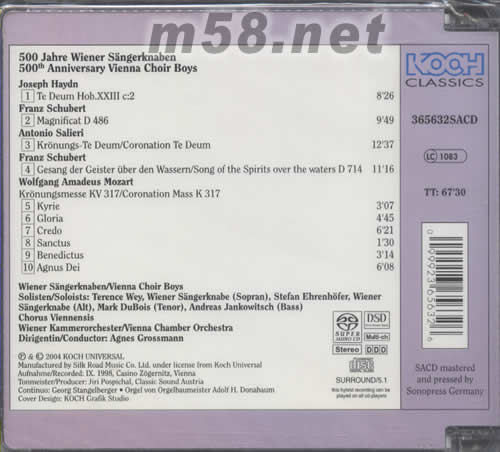 JOSEPH HAYDN 1、TE DEUM HOB XXIII C:2 FANZ SCHUBERT 2、MAGNIFICAT D486 ANTONIO SALIERI 3、KRONUNGS-TE DEUM/CORONATION TE DEUM FRANZ SCHUBERT 4、GESANG DER GEISTER UBER DEN WASSERN/SONG OF THE SPIRITS OVER THE WATERS D 714 WOLFGANG AMADEUS MOZART KRONUNGSMESSE KV 317/CORONATION MASS K317 5、KYRIE 6、GLORIA 7、CREDO 8、SANCTUS 9、BENEDICTUS 10、AGNUS DEI