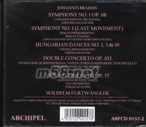 JOHANNES BRAHMS SYMPHONY NO.1 OP.68 CONCERTGEBOUW ORCHESTRA AMSTERDAM SYMPHONY NO.1(LAST MOVEMENT) BERLIN PHILHARMONIC BERLIN (ONLY SURVIVING RECORDING FROM THIS CONCERT) HUNGARIAN DANCES NO.1,3&10 VIENNA PHILHARMONIC VIENNA DOUBLE CONCERTO OP.102 WOLFGANG SCHNEIDERHAN,VIOLIN;ENRICO MAINARDI,VIOLONCELLO LUCERNE FESTIVAL ORCHESTRA LUCERNE VIOLIN CONCERTO OP.77 GIOCONDA DE VITO ,VIOLIN RAI ROCHESTRA TORINO WILHELM FURTWANGLER