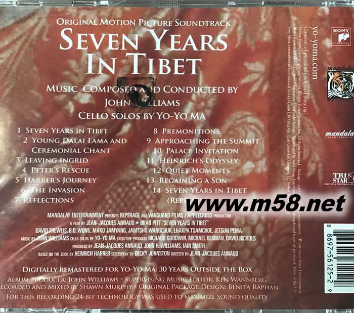 1. Seven Years In Tibet [7:07] 2. Young Dalai Lama And Ceremonial Chant [2:17] 3. Leaving Ingrid [3:43] 4. Peter's Rescue [3:46] 5. Harrer's Journey [4:02] 6. The Invasion [5:07] 7. Reflections [4:41] 8. Premonitions [2:56] 9. Approaching The Summit [5:46] 10. Palace Invitation [4:46] 11. Heinrich's Odyssey [8:03] 12. Quiet Moments [4:23] 13. Regaining A Son [1:49] 14. Seven Years In Tibet (Reprise) [7:11]