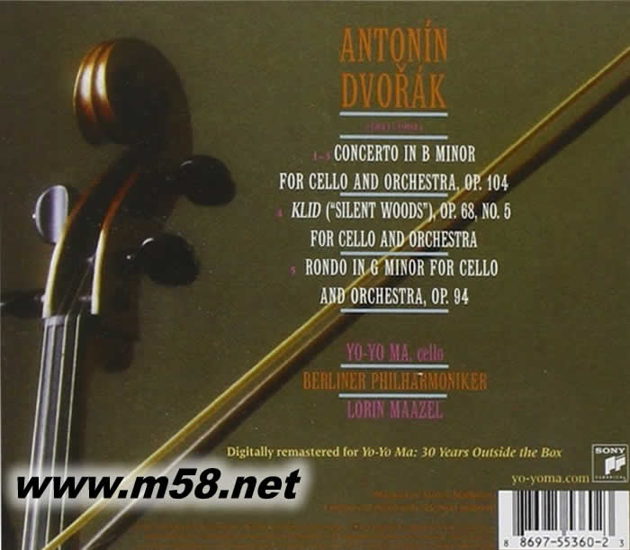 德沃夏克 大提琴協奏曲 回旋曲 DVORAK: Cello Concerto; Silent Woods; Rondo(m58.net) 馬友友 Yo-Yo Ma (大提琴) 馬捷爾Lorin Maazel (指揮) 柏林愛樂 Berlin Philharmonic Orchestra 馬友友多次演奏德弗札克的作品,於1986年第一次灌錄這首曲目,洋 溢著熱情氣息的詮釋。 《寂靜的森林》是德弗乍克根據鋼琴作品《來自波西米亞森林》中《寂靜的森林》改寫成的大提琴曲目。 這首德弗札克這首迷魅世人愛上大提琴的《b小調大提琴協奏曲》1895年創作於紐約,音樂中蘊藏了他對於家鄉的懷念,以及他受到美國黑人靈歌與民間音樂影響的旋律特質。次年於倫敦首演,連當時最嚴苛的樂評也承認它是杰作,而現在它已是全世界最受歡迎的大提琴協奏曲作品。德弗札克可說是他同代中最瞭解大提琴的表現力與潛力的作曲家,馬友友多次演奏這位作曲家的作品,這個版本則是於1986年第一次灌錄這首曲目,精采絕倫,洋溢著熱情氣息的詮釋。