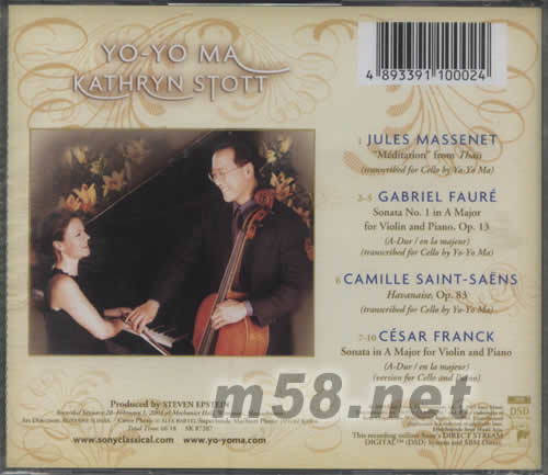 1 JULES MASSENET “meditation”from thais (tramscribed for cello by yo-yo ma) 2-5 gabriel faure sonata no.1 in a major for violin and piano,op.13 a-dur l en la majeur) transcribed for cello by yo-yo ma ) 6.camille saint-saens havanaise,op.83 (transcribed for cello by yo-yo ma) 7-10 cesar franck sonata in a major for violin and piano (a-duri en la majeur) (version for cello and piano)