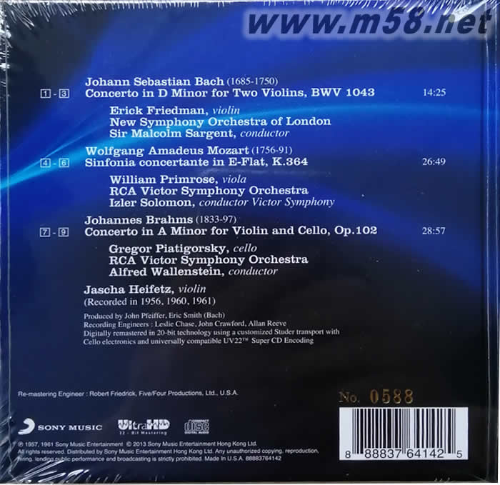 DOUBLE CONCERTOS ULTRAHD 限量版(m58.net) Sony Music Hong Kong與FIM (First Impression Music) 合作之經典名盤. 全部母帶Re-mastering及壓碟過程均在美國處理, 每款CD附有詳盡Precision Replication Report 測試報告, 製作嚴謹, 高質原音表現! 每款首批1,000張, 特別印有獨立編號更顯珍貴! 海飛茲是個不折不扣的傳奇人物,他的影響力至今仍深深影響著全世界學小提琴的人。他是當今小提琴家中,為人們留下最多錄音的一位,其出神入化的琴技在這份錄音中充份體現,特別是他在RCA唱片公司錄製發行的唱片被稱為權威演繹極致,至今仍雄踞各榜首且為樂迷津津樂道。美國小提琴教父艾薩克.史坦(Issac Stern)說:「海飛茲是二十世紀小提琴界中最強力而深遠影響」。這份Ultra HD 32-bit 錄音更加細膩展現海飛茲的完美演出。 巴赫的「D小調雙小提琴協奏曲」、莫札特的「降E大調協奏交響曲」、布拉姆斯的「小提琴與中提琴的雙重協奏曲集」是古典音樂史上zui膾炙人口的三大經典協奏曲」,由海飛茲(Jascha Heifetz,1900-1987)擔綱演奏, 收在同一張專輯里,實在是發燒友及樂迷之耳福。雙提琴協奏曲由Platlgorsky(大提琴)、Primrose(中提琴)、Friedman(小提琴)三位提琴家和海菲茲共同演繹。 海菲茲演繹布拉姆斯深刻動聽;莫扎特清新自然,靈感十足;巴赫雍容古樸,不愧為一代宗師。 海飛茲是個不折不扣的天才兒童,自帕格尼尼后,演奏小提琴有著極重要影響力的巨匠。他的演奏曲式霸氣而恢弘、技巧高超精確而完美、從不拉錯一個音。 權wei樂評人Herbert F Peyser 說:「克萊斯勒是國王,海飛茲則是先知。
